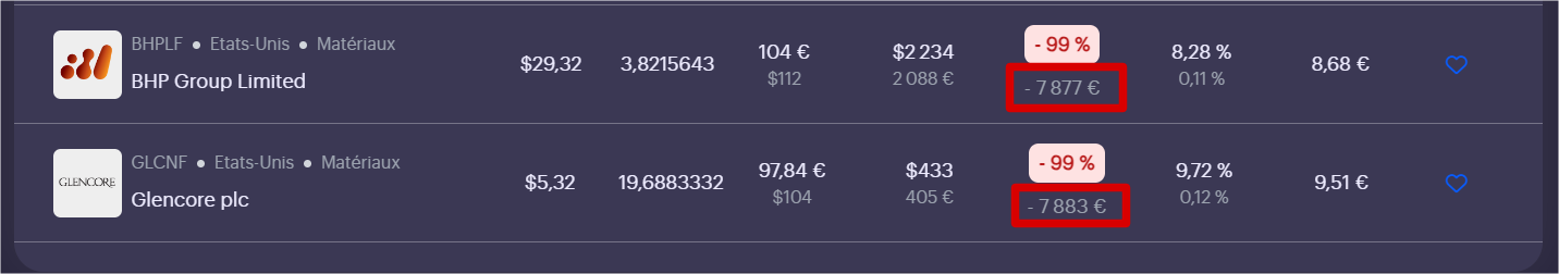 C’est parce que notre système a récupéré les cotations US en $ plutôt que les cotations de Londres. Clique sur les trois petits points au bout de la ligne puis sur « Modifier » et là , tu peux changer l’actif pour mettre l’action cotée à Londres. Dans ton cas : BHP.L et GLEN.L